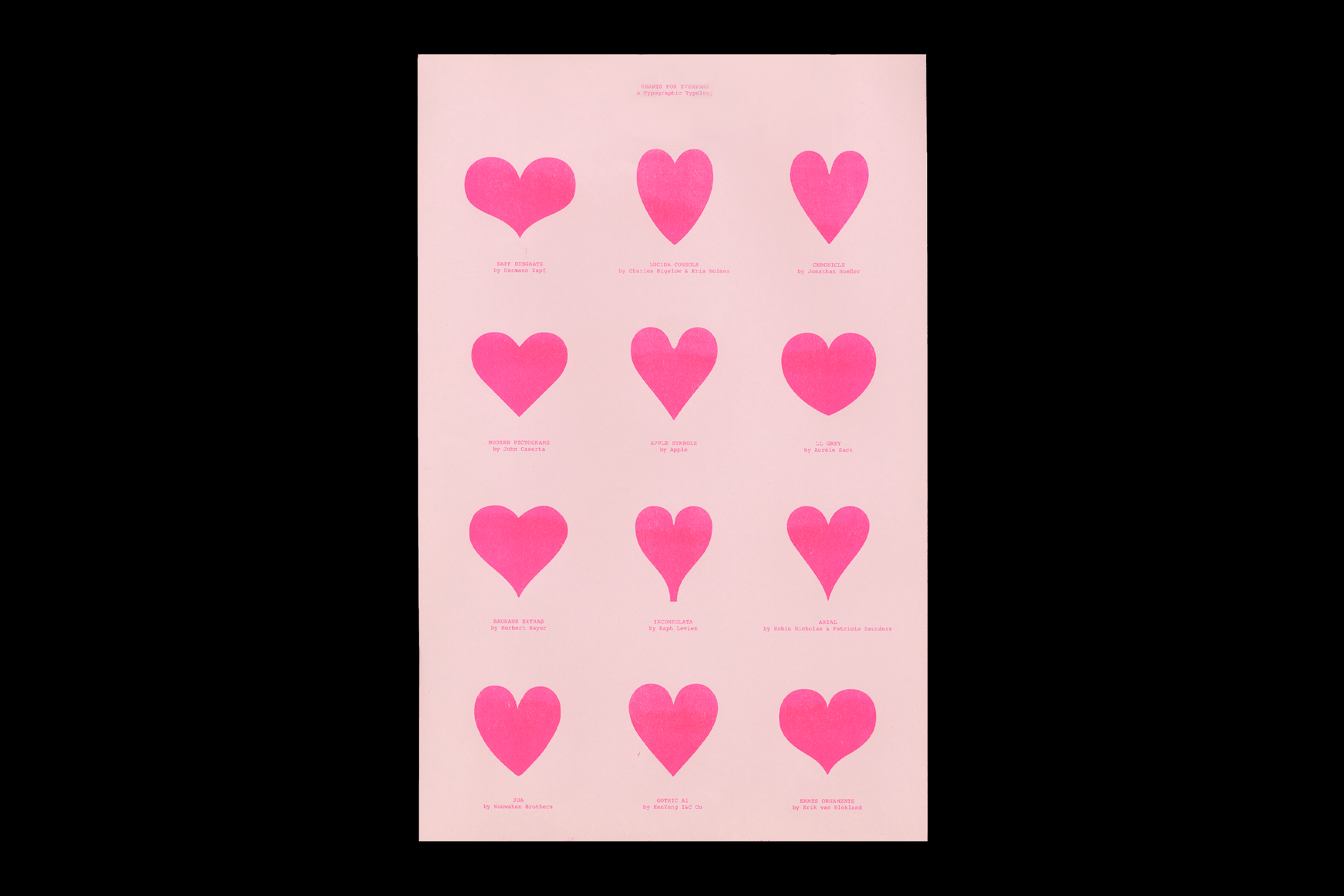 A poster showcasing a typology of twelve heart glyphs, each one from a different typeface. A smaller version with fewer hearts was first released in 2010. This revised and expanded version was designed by Adam Swift Lucas for a mutual aid Risograph print series organized by Oddities Prints in 2020, re-printed here on lightweight carbon copy paper in four different colors. Typeset in Courier by Howard “Bud” Kettler.
