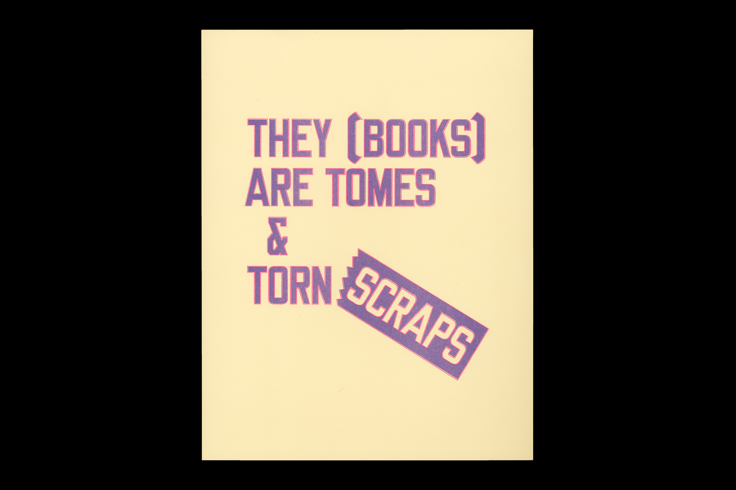 A series of three 2-color Risograph prints featuring invented idioms about artist books. They are written loosely based on the myriad ways that artists describe books in Art Rite No. 14 (1976), an issue devoted to the artist book. One of those descriptions is from Lawrence Weiner, whose work serves as the inspiration for the typographic treatment of these prints. They are an homage to the late artist, made shortly after he passed in December of 2021.